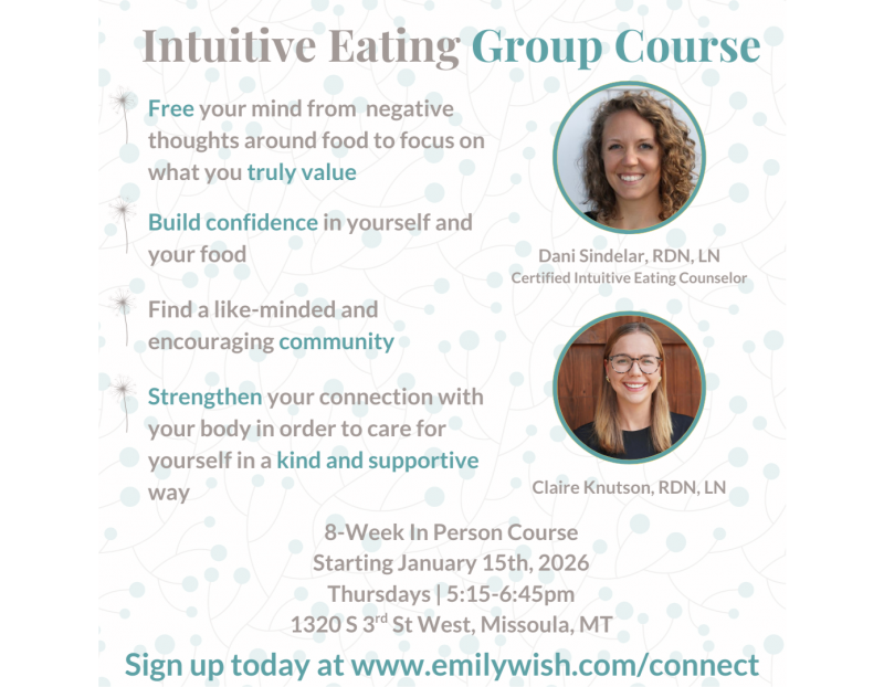 Emily Wish, LLC offers an Intuitive Eating Program for those wishing to build a peaceful and authentic relationship with food and body. The aim of the course is to create awareness of the often traumatic aspects of diet culture and the internalization it has instigated in such an influential way that we have fused with the belief that the problem is us. We are here to tell you that we are not the problem, nor have we ever been.