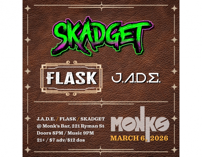 Rock, rock and a side of rock. Local legends J.A.D.E and SKADGET sandwich FLASK in a comfortable set of all-caps music. J.A.D.E brings sweet and salty alternative rock, FLASK offers weird rock opera story songs and SKADGET, well you know, Psychedelic Prog Rock.
