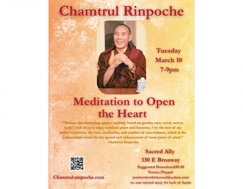 Join us for an evening of learning and meditation with Tibetan Buddhist teacher Chamtrul Rinpoche. This event is by donation only and all are welcome!