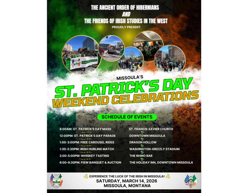 This full day of festivities is proudly brought to you by the Friends of Irish Studies in the West and the Ancient Order of Hibernians, and all are invited to join the celebration in the heart of Missoula.