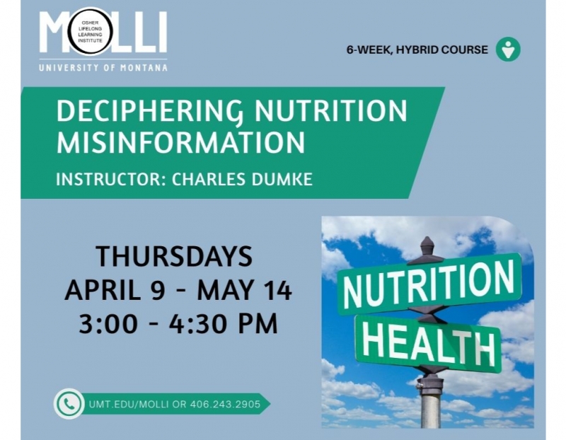 1.5-hour, 6-week course on Thursdays, April 9 - May 14. Fee $70 ( one-time annual MOLLI membership fee of $40). Offered in-person and remotely. Instructor: Charles Dumke. Confusion exists around nutrition information delivered to the public. This has been the case historically but has increased with internet influencers. This course is intended to rectify this confusion and provide insights on why nutrition is subject to misinformation.