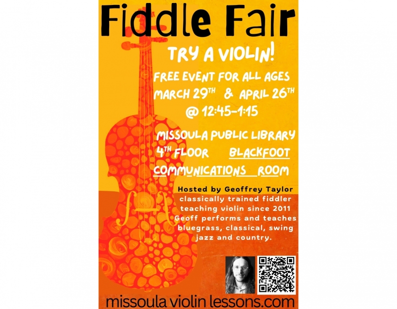 Try a Violin with Geoffrey Taylor of Missoula Violin Lessons from 12:45-1:15pm in the Blackfoot Communications room on the 4th floor of the Missoula Public Library. March 29th and April 26th.