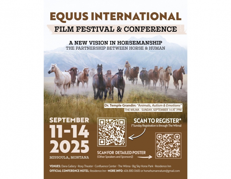 Equine and Animal Welfare Conference with Award Winning Horse Films from this year's Equus International Film Festival. Speakers include Temple Grandin, renowned for her work with animals and autism, Rebecca Bailey, an early pioneer in animal assisted therapy, filmmakers and films about horses and humans and the bond we share; horse demonstrations at the Big Sky Horse Park and many panels and speakers.