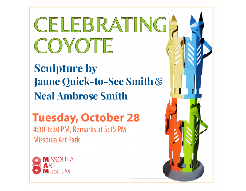 Join us for a special evening celebrating the installation of Es wi?ms c?? es mlk??mulex? t snc??l?ep – Coyote is Seeing All of the Land, a monumental 20-foot steel sculpture created by renowned artist Jaune Quick-to-See Smith (1940-2025, Citizen of the Confederated Salish and Kootenai Nation) in collaboration with her son Neal Ambrose Smith (Salish descendant). Realized in the final months of Quick-to-See Smith’s life, this visionary work fulfills her long-held dream to create a sculpture for Missoula’s Art Park. The sculpture was fabricated locally by Wolf Magritte and stands as a bold, playful, and powerful presence. This powerful artwork reflects Quick-to-See Smith’s lifelong mission to amplify Indigenous voices and confront historical injustices. Set against the colonial façade of the old Carnegie Library building, the sculpture is a strong declaration of ongoing Séliš presence. MAM is honored to see this visionary project come to life, and to carry her work forward with her blessing. We invite the community to join Neal Ambrose Smith in celebrating Quick-to-See Smith’s lifelong legacy and the arrival of this landmark public artwork. A brief program of remarks will begin at 5:15 PM and is free and open to the public.