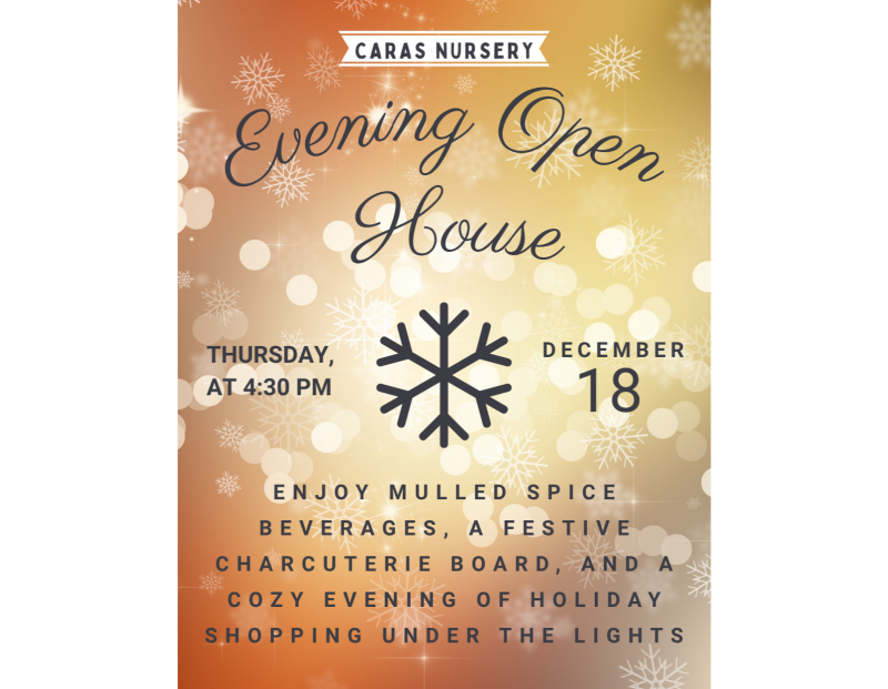 Enjoy mulled spice beverages, a festive charcuterie board, and a cozy evening of holiday shopping under the lights